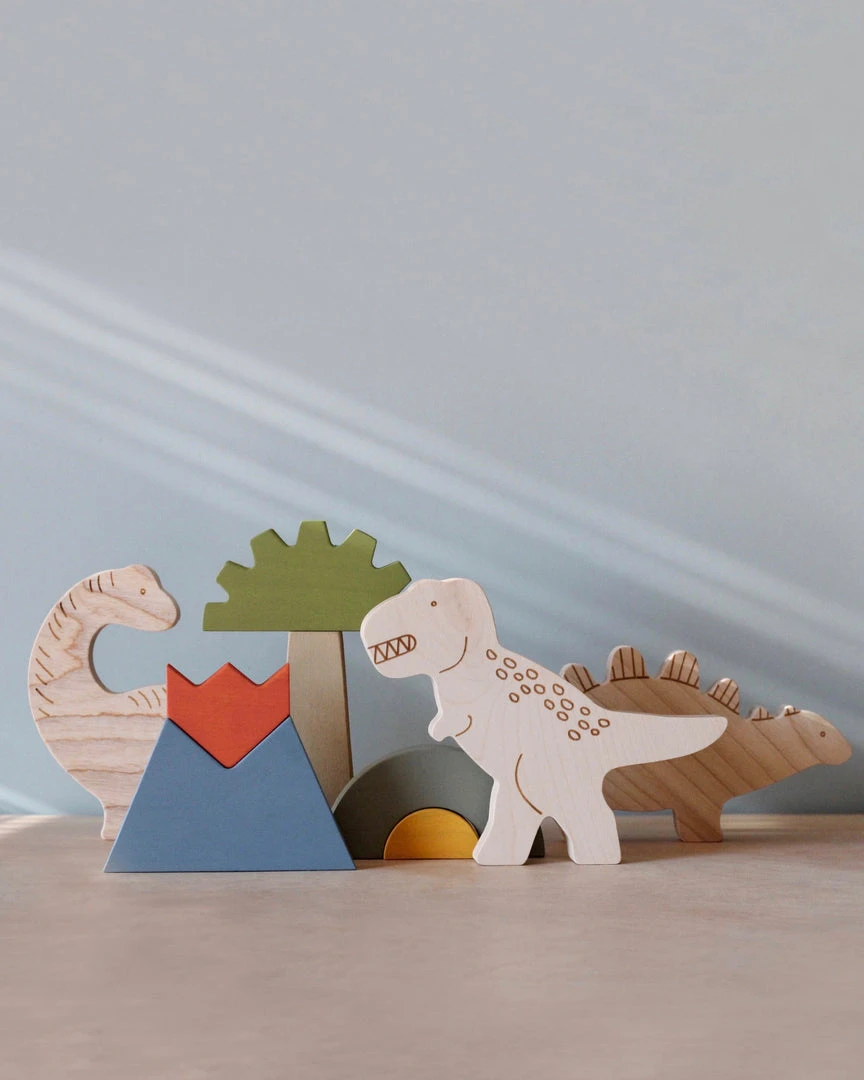 This set includes three dinosaurs made out of maple wood and six hand painted objects. This is a great toy for encouraging concentration and developing fine motor skills and thinking.Â