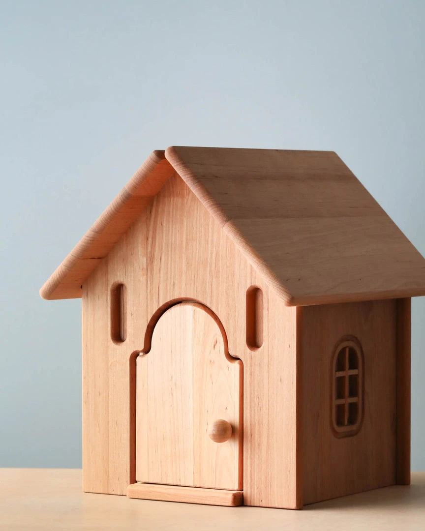 Handmade in Poland by DrewArt. This Waldorf inspired house is crafted from Alder wood. The roof opens to give access to play inside.
