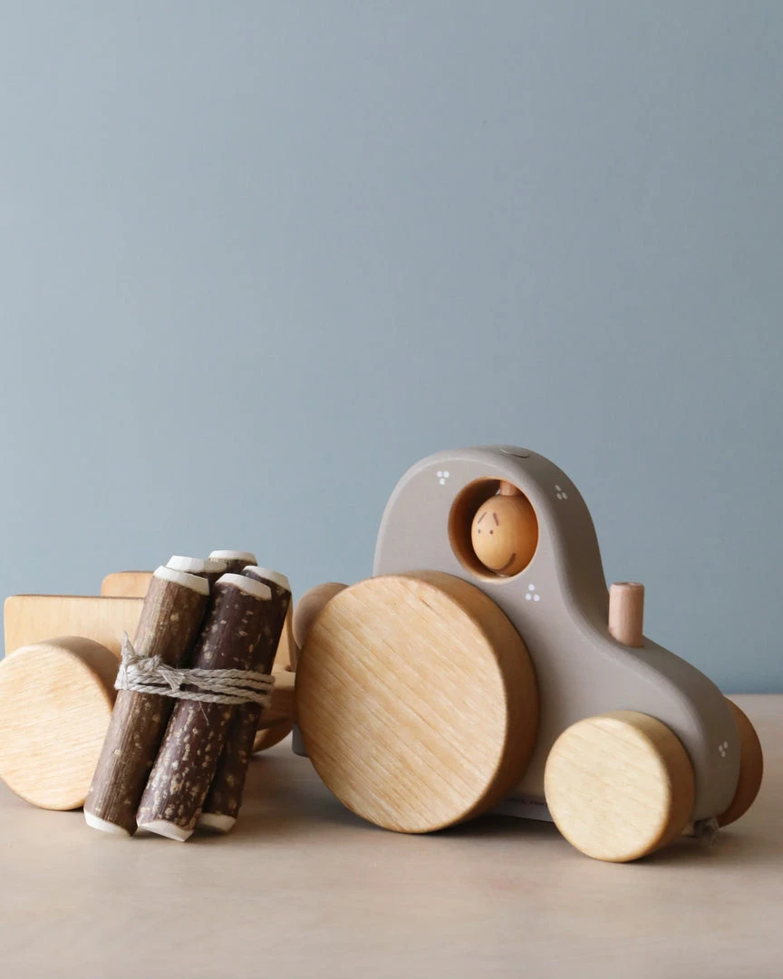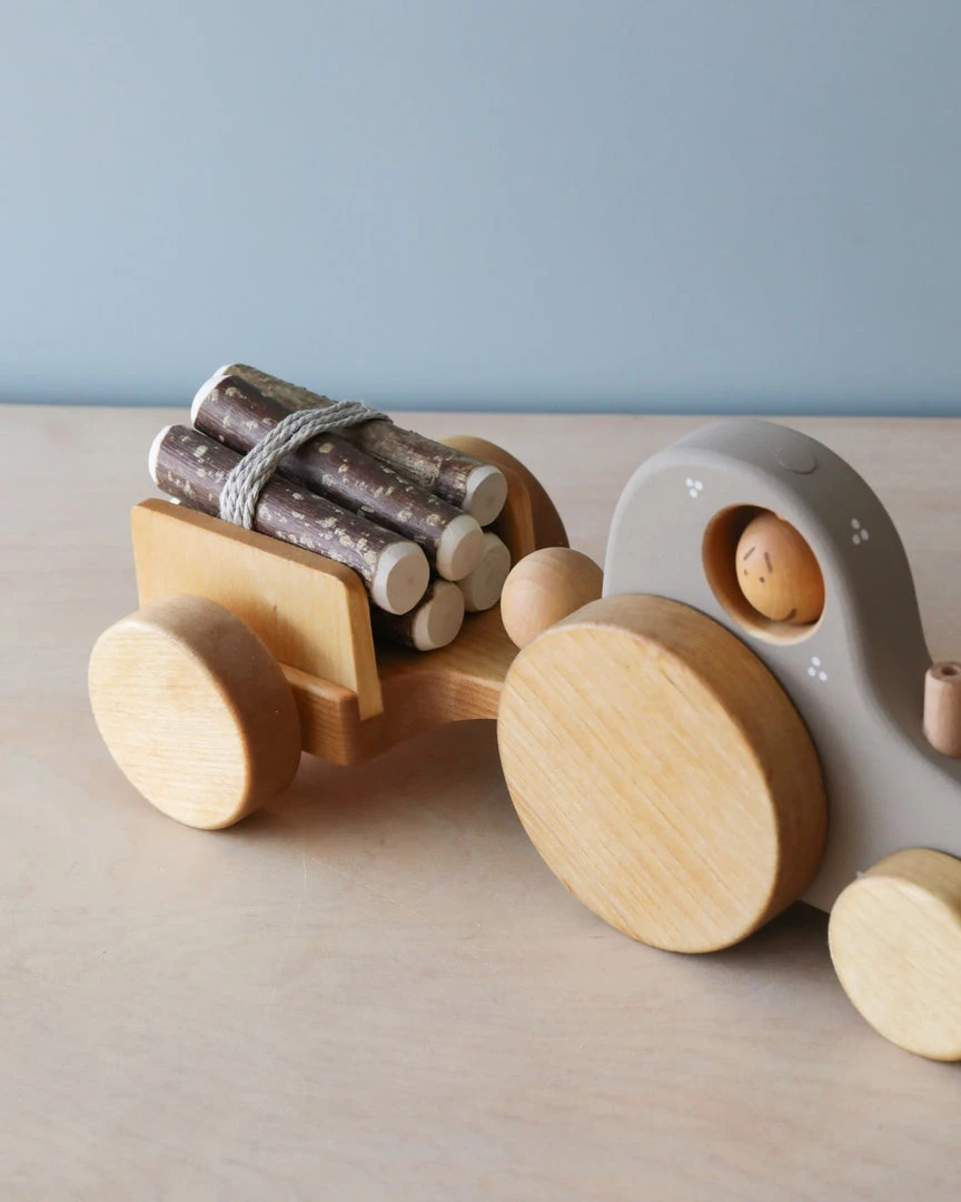 Handmade wooden tractor with a detachable trailer that includes logs.
