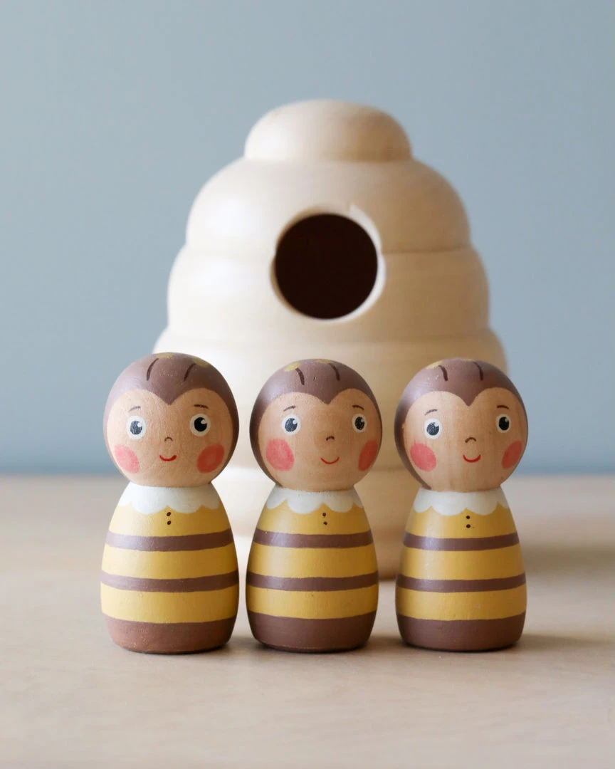 This adorable set includes a beehive and three handprinted wooden bee peg dolls.Â