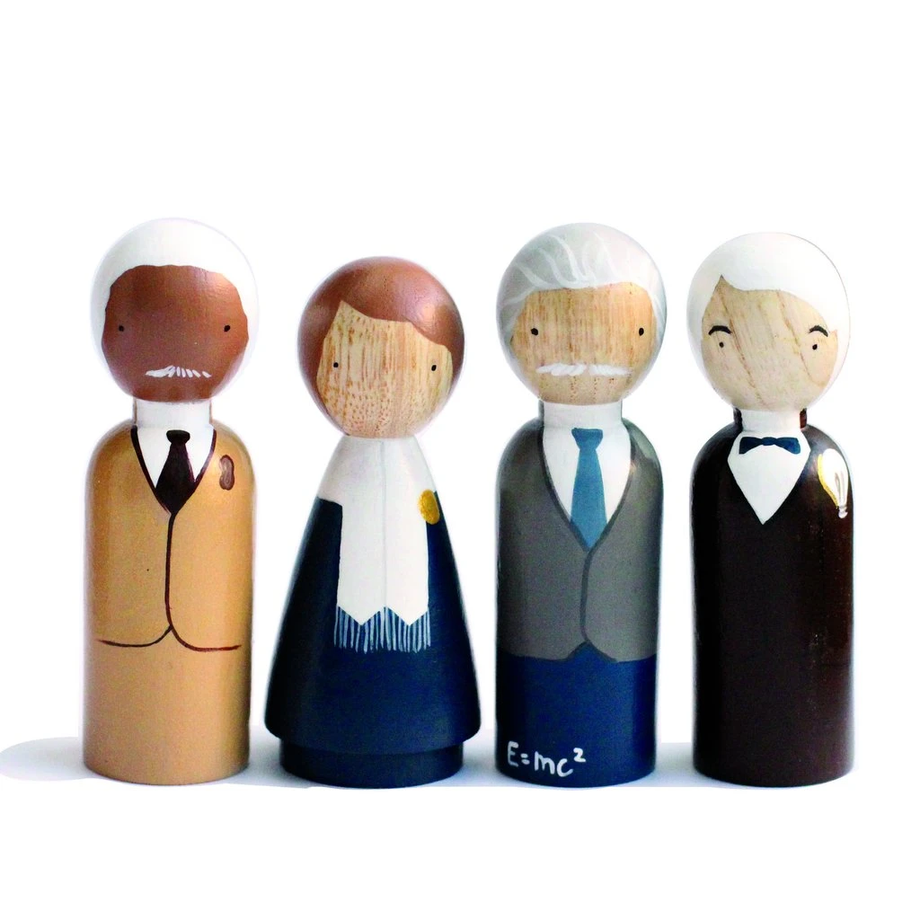 The Scientists doll set includes four 3.5″ dolls. George Washington Carver, Marie Curie, Albert Einstein, and Thomas Edison.