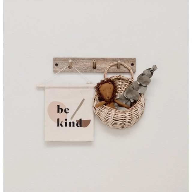 “Be Kind” sewn and screen printed by hand on natural canvas by Kenyan artisans. s p e c s + natural canvas + dowel rod + 9in x 6.5in