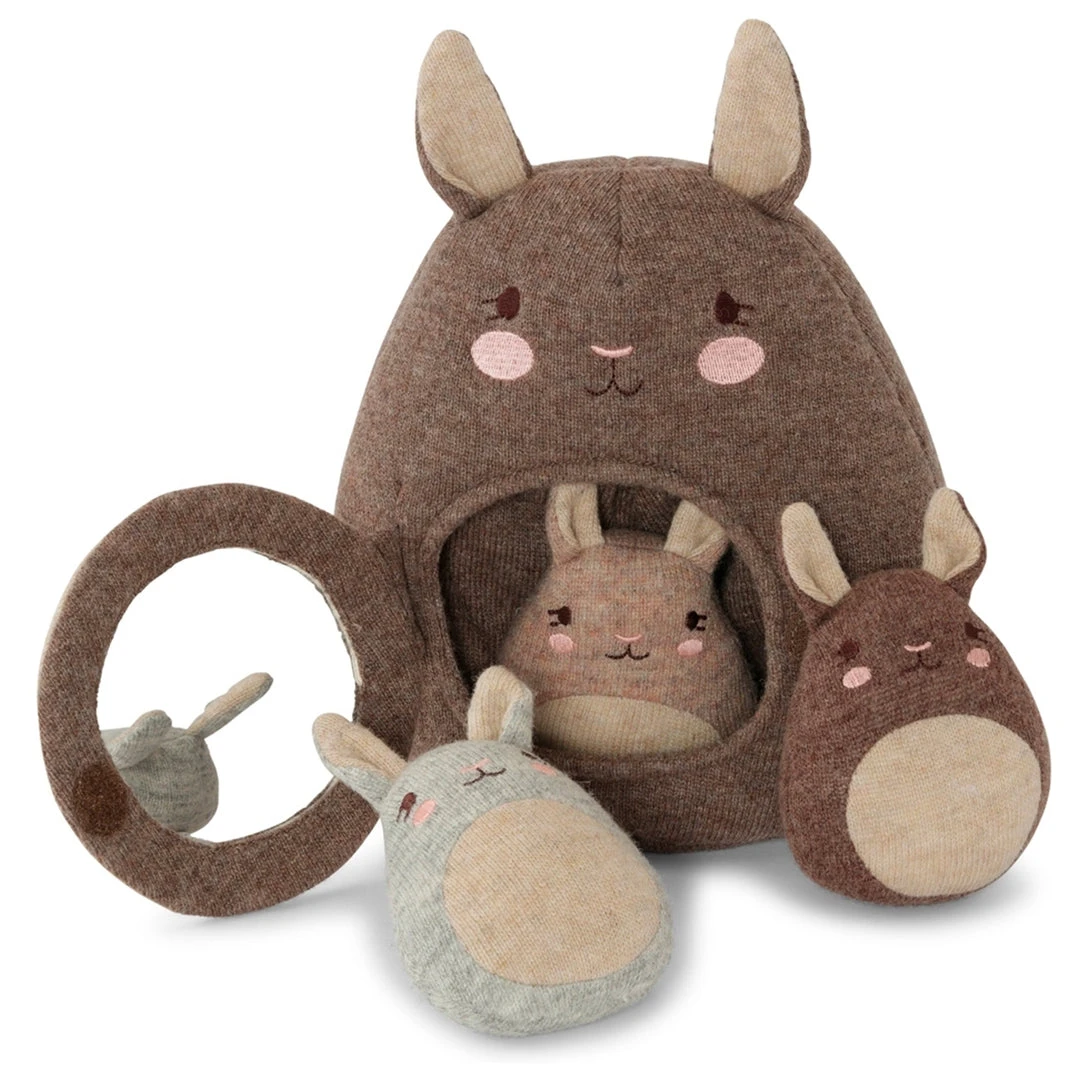 This kangaroo toy is made in 80 percent wool and 20 percent nylon with polyester lining. The kangaroo carries three babies inside that all make a gentle jingle sound when played with. The tummy has a velcro closure and a plastic mirror inside. The mother’s ears make a crinkle sound.