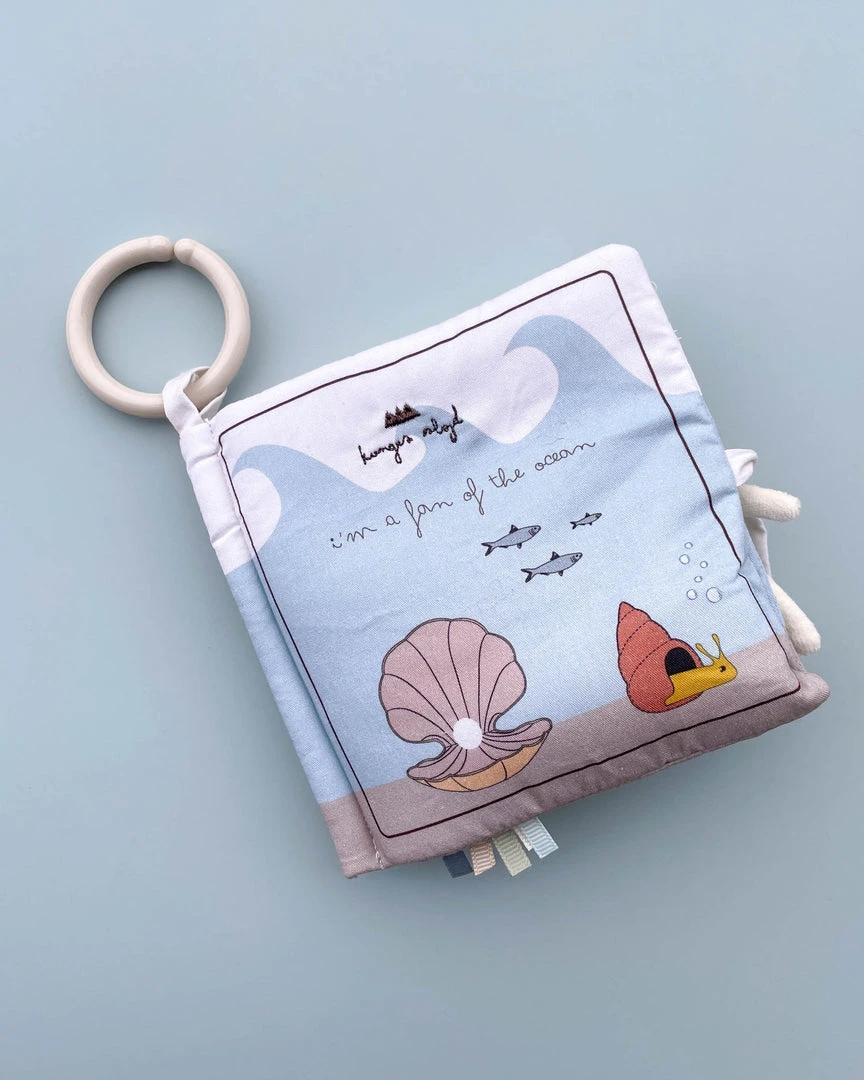 This cute fabric book can be attached to a stroller or used independently as an activity toy for your baby. Inside the fabric book your little one will discover lots of interesting finds.