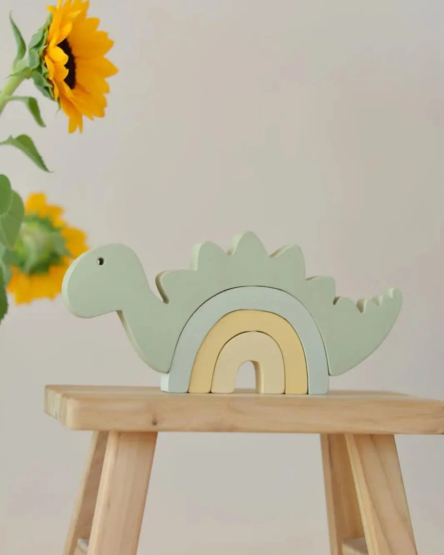 This dino stacker is painted with green and yellow tones.  It is made of beech wood and consists of 4 parts. A little twist for Dino and stacking toy lovers.