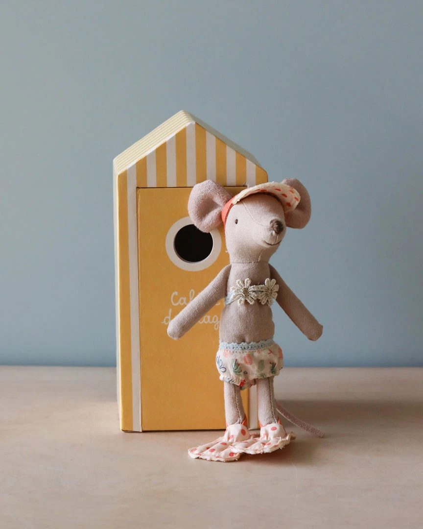 Big Sister mouse is ready for the beach! She loves her new flower bikini, and matching visor and flippers! She comes with her beautiful, yellow beach house.