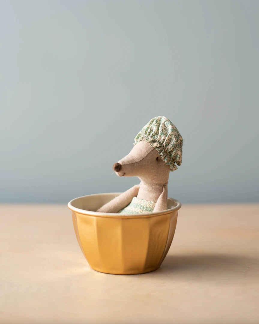 Rub a Dub Dub there is a mouse in the tub. Ms. Mouse gets squeaky clean, but her ears stay dry with her shower cap. She is a resourceful little lady by using a cute painted metal cup for her tub.