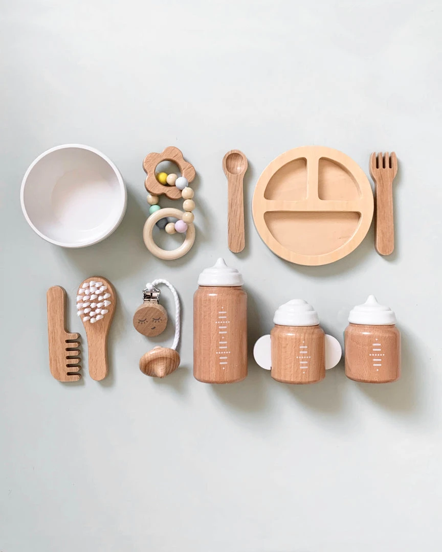 Enhance their play time with our beautiful wooden doll accessories kit. It has everything a (pretend) bub could need as your little one immerses themself in creative play. They can feed, entertain and soothe baby, brush their hair and get them ready for the adventures they’ve planned for the day. 11 Piece wooden accessories kit for imaginative play with your favourite dolls or toys.