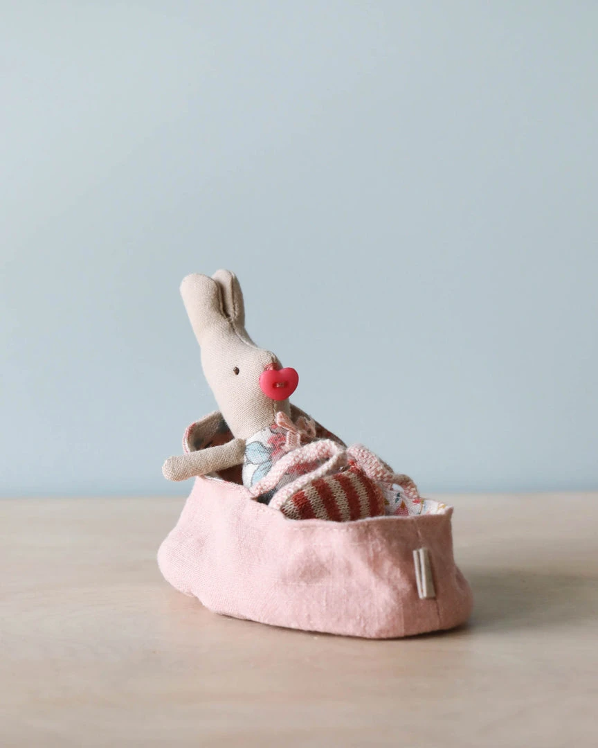Look who’s arrived! ‘My’ Rabbit in a Cot is sure to melt your heart. This little rabbit has an adorable floral body, fuzzy little tail‚ a cute rose-colored scarf, and a matching heart-shaped pacifier. The rose-colored cot is made with super soft cotton that will keep your bunny snug as a bug. The blanket is reversible with stripes on one side and a floral pattern to match the carry cot lining on the other.