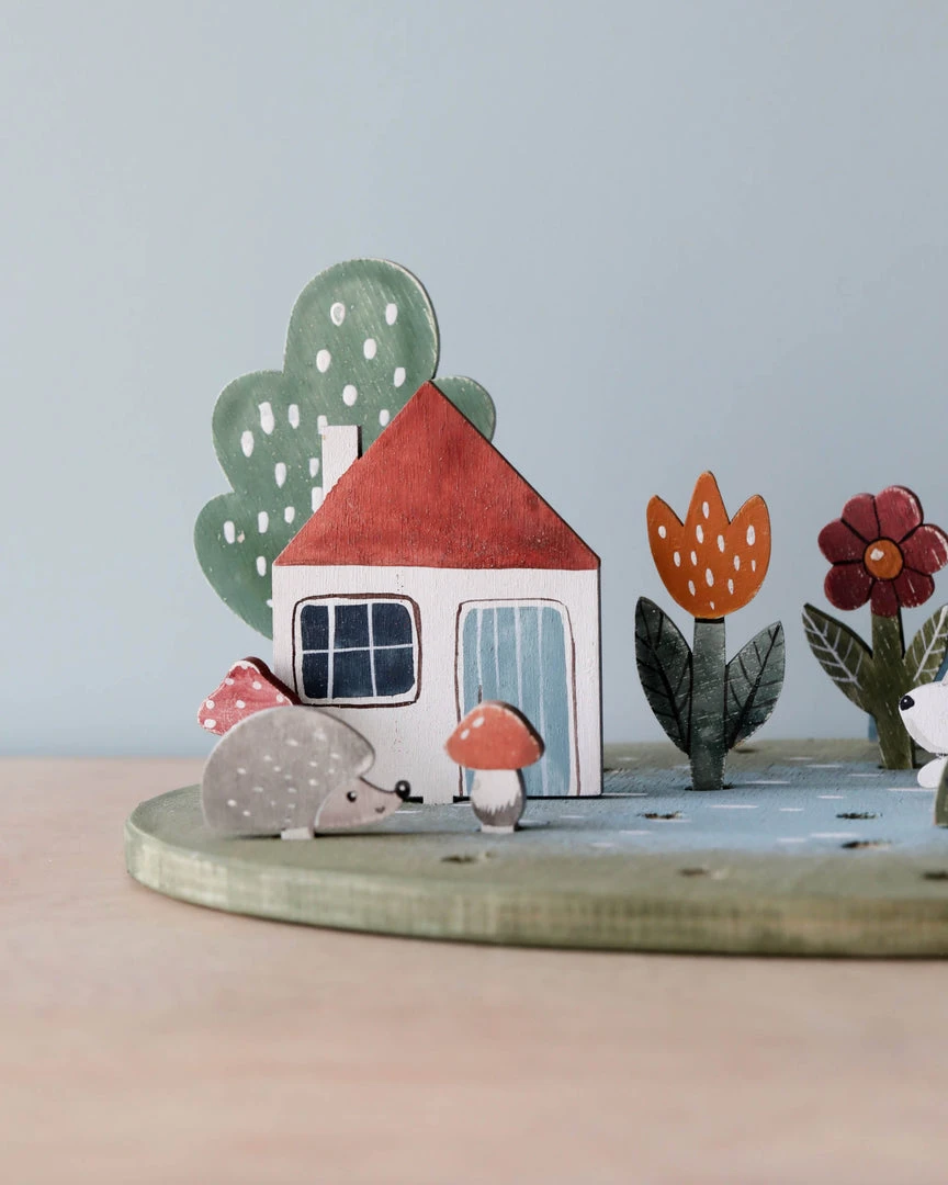 This set includes a board and 16 forest objects. The board consists of lots of little slots that will hold the play objects and providesÂ