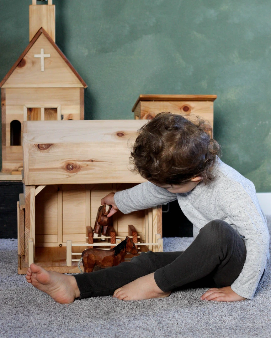 Handmade in USA from pine and Douglas fir wood, and coated with food grade mineral oil. This large barn features two levels with a removable ladder, two horse stalls and a wooden fence.Â