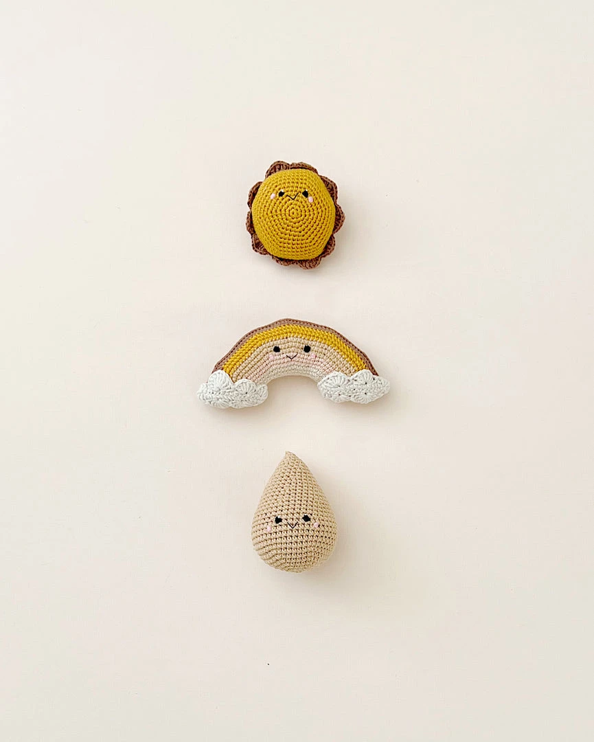 This set includes a sun rattle, rain drop rattle and a rainbow rattle.Â