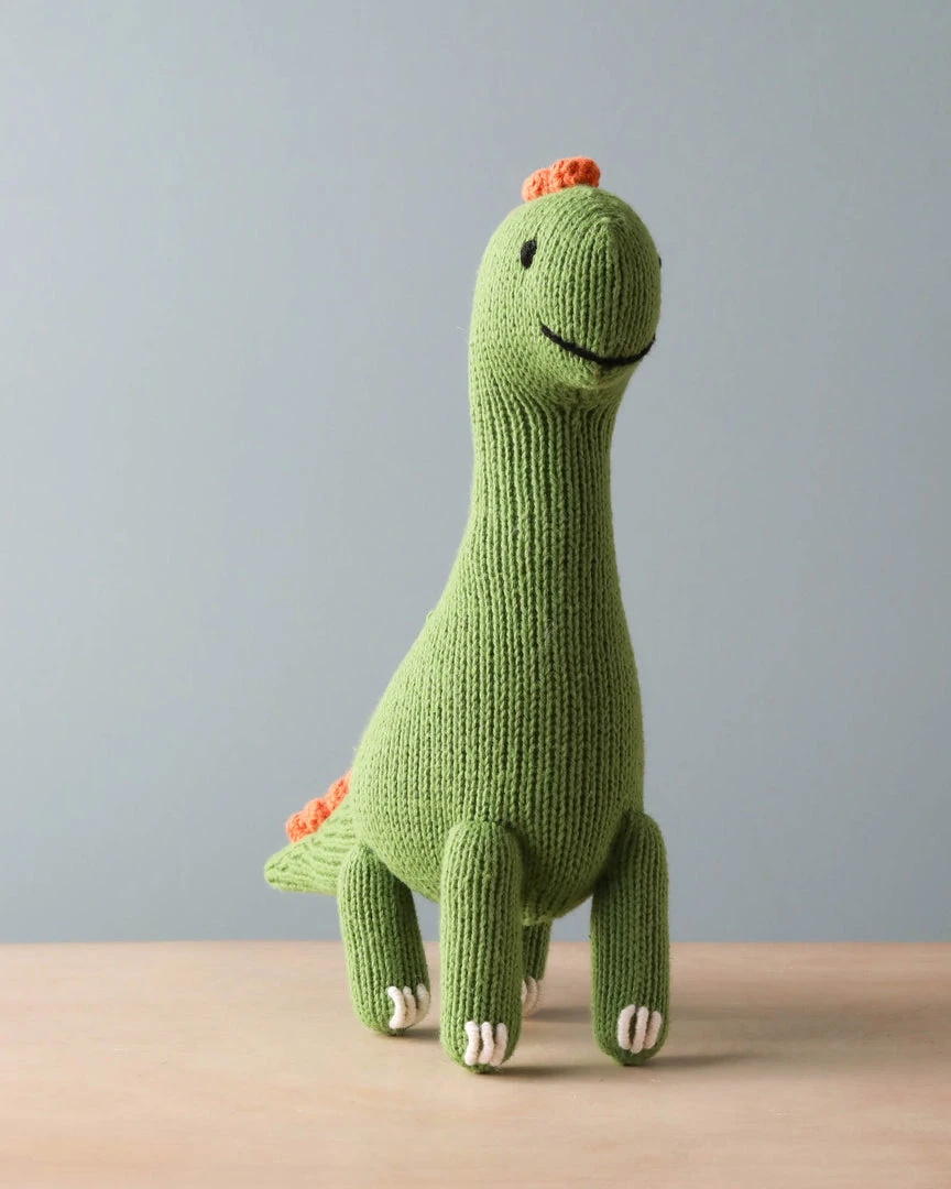 Bring a smile to adults and kids alike with this Knit Brontosaurus Dinosaur Toy. This plush prehistoric pal is knit in the highlands of Peru from soft alpaca wool. Each purchase supports women artisans in southeastern Peru by granting access to health care and education to them and their families.