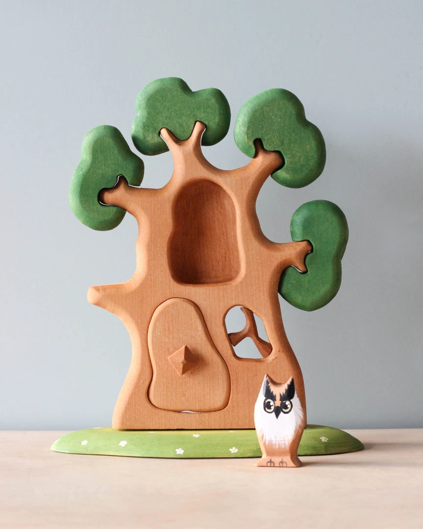 Handmade from linden wood and painted with non-toxic paint, this set includes 8 removable pieces and includes the wooden owl. Â
