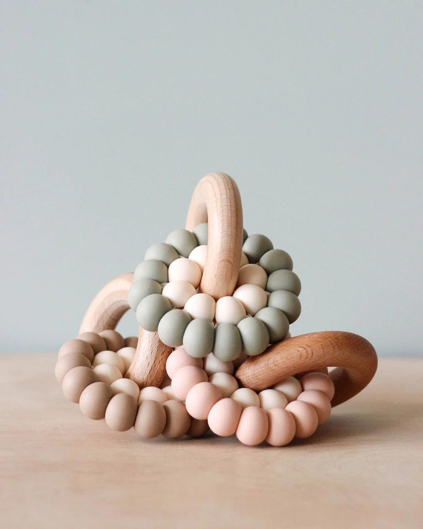 These teethers are a perfect size and shape for little hands to grasp and, combined with our buttery soft silicone beads and natural beechwood ring makes for the ideal teether to massage sore gums.Â