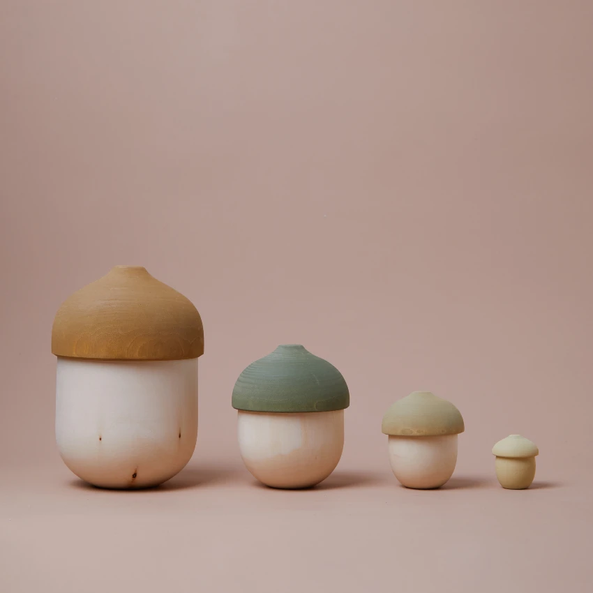 This set includes four handmade acorns, nesting neatly inside each other.
