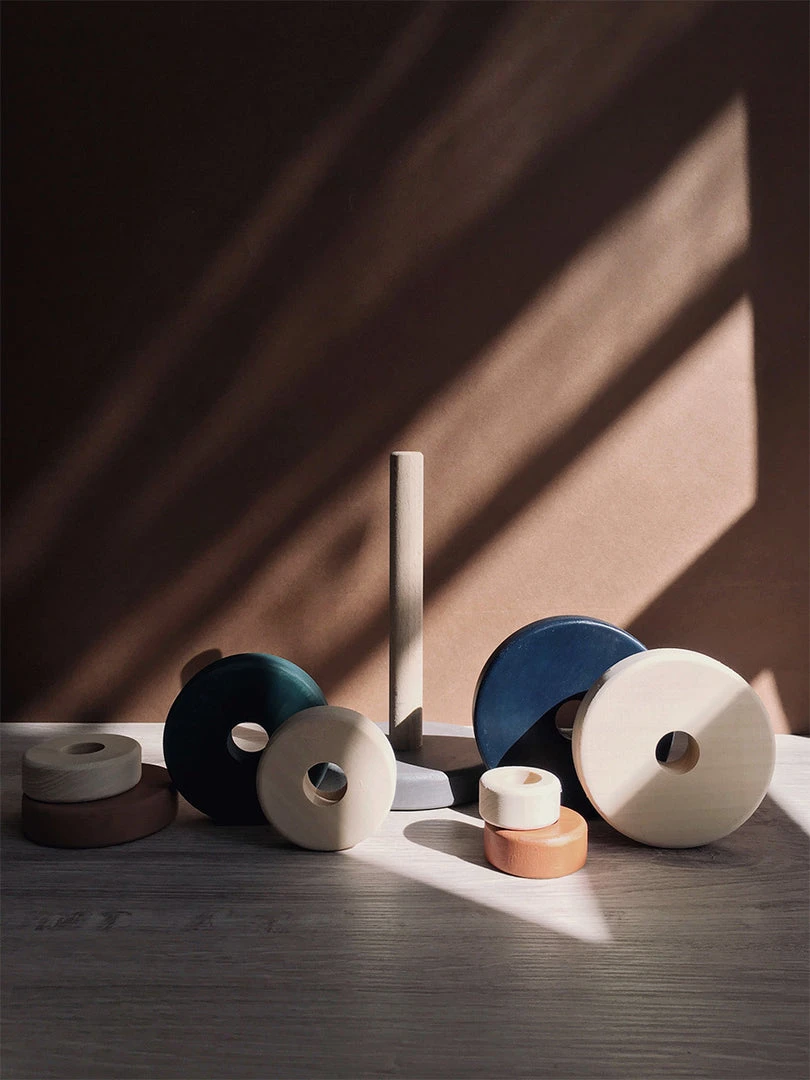 Handmade by Sabo Concept in Ukraine and painted with non-toxic, water-based paint. This stacking toy is great for hand-eye coordination.Â