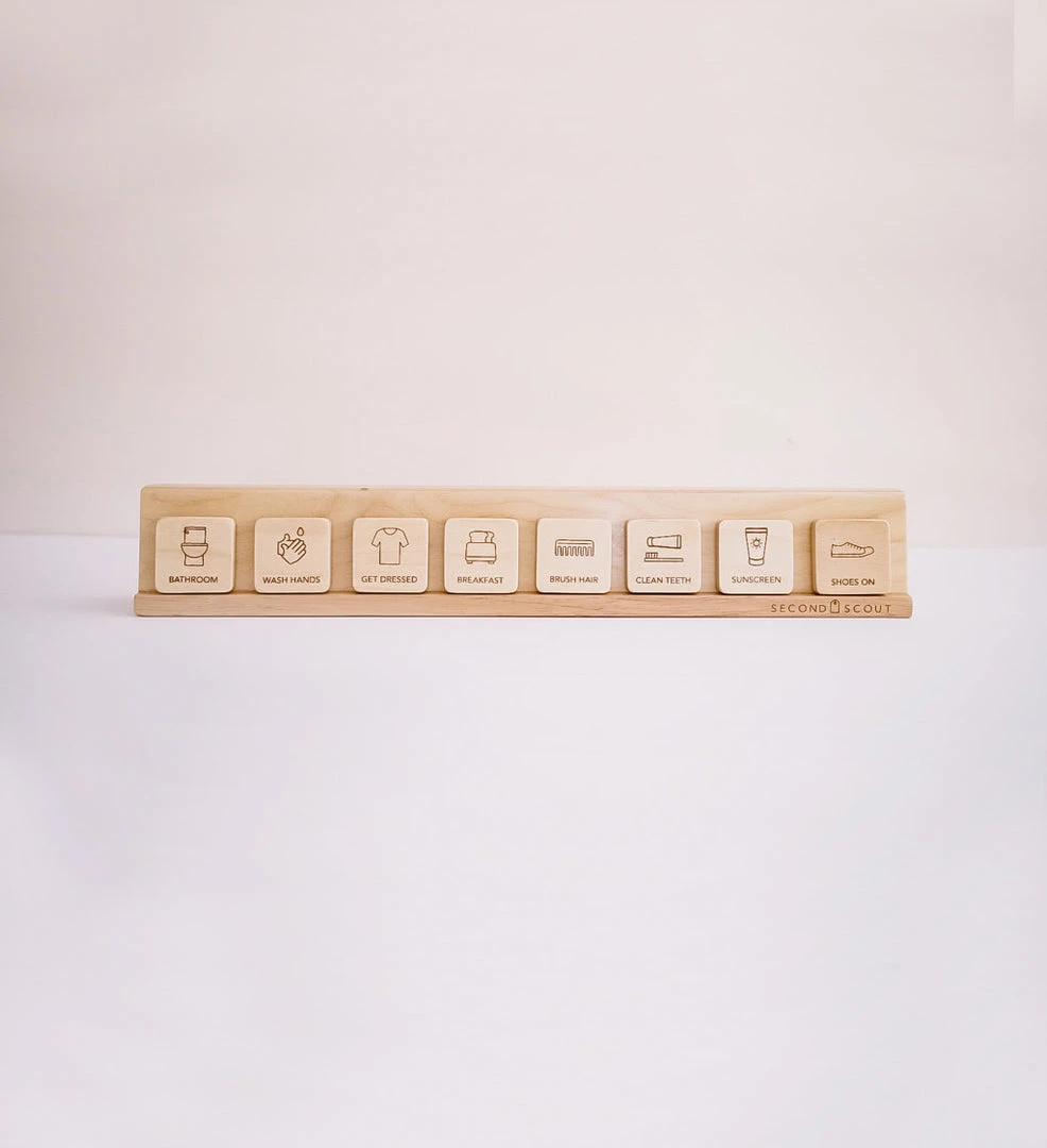 Morning tiles – breakfast, bathroom, clean teeth, get dressed, brush hair, sunscreen, shoes on, snack, wash hands, lunch