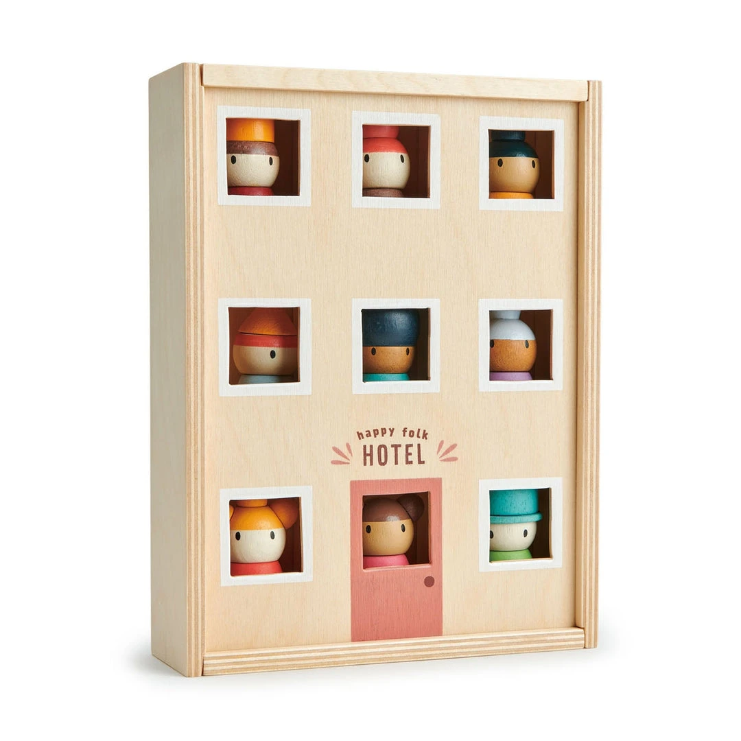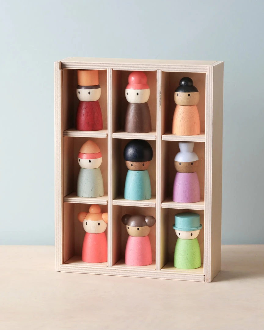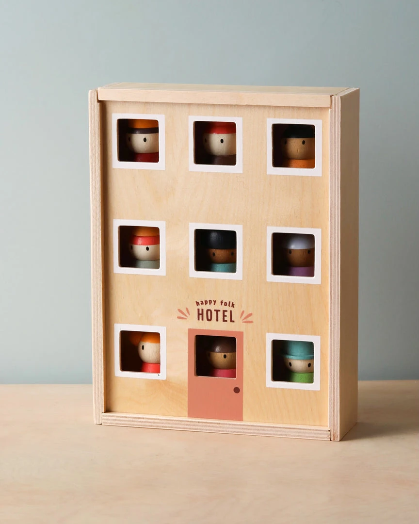 Part of our open-ended play, meet the 9 folks who reside at the happy hotel. Made from solid wood, colored with a soft water based stain, they can represent anyone you know. These little people are perfect for adding to any sort of creative or imaginative play, and can be perched easily on any surface.