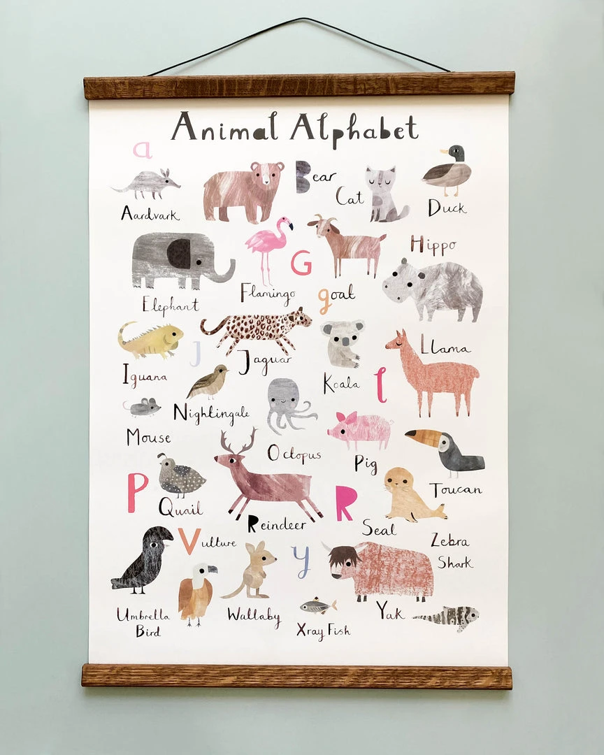 An animal alphabet print of an original illustration. Featuring lovely collaged animals from A to Z, this beautiful animal alphabet is both educational and fun.
